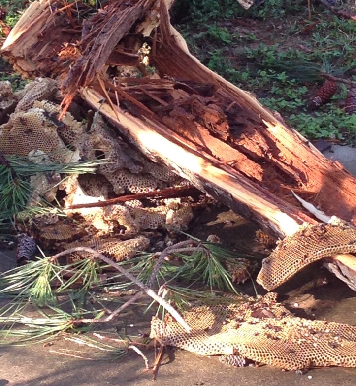 This was what I saw as I came around a turn on the running path this morning only a couple of minutes into my run. Last night a loud thunderstorm passed through leaving branches and this partial tree on the ground, as well as lots of rain. The tree was home to a hive of bees and you can see their honeycomb. Pretty cool!