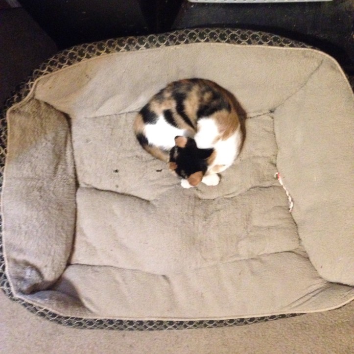 Not a day passes without my boys petting and holding them. The Calico, Zena , is much bigger and fatter than her sister Sweetie. But they are both ferocious when they play fight ! Even our standoffish grown female cat seems to enjoy a little playtime with them . She will climb up on a chair and dangle her swinging tail and then attack when take the bait. For a few minutes anyway , then she slinks off . If only they could stay like this a little longer .
