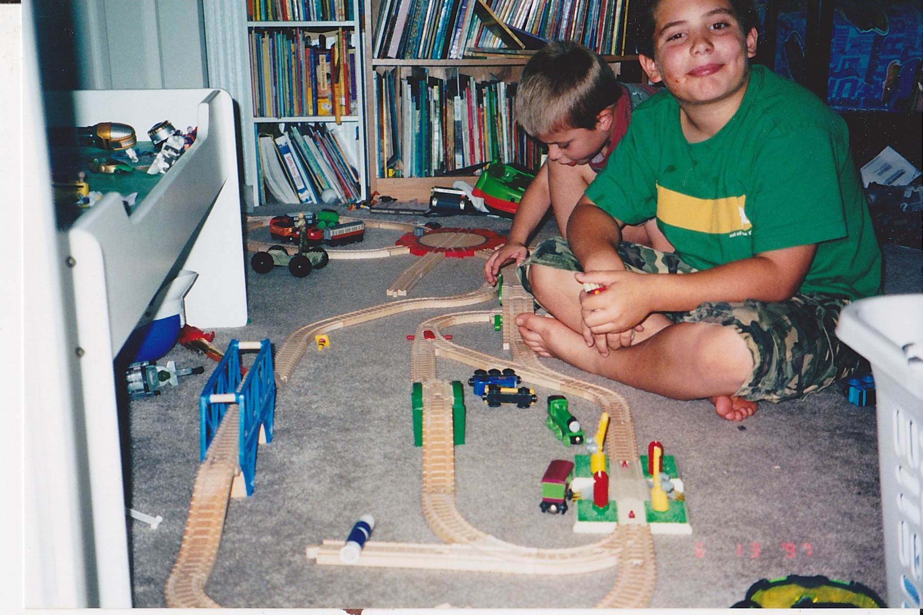 Kids playing with a train set.