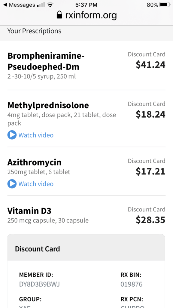 These were the drugs prescribed by our regular doctor. She did NOT offer us monoclonal antibodies and we didn’t know that you should get that treatment BEFORE you end up needing oxygen.