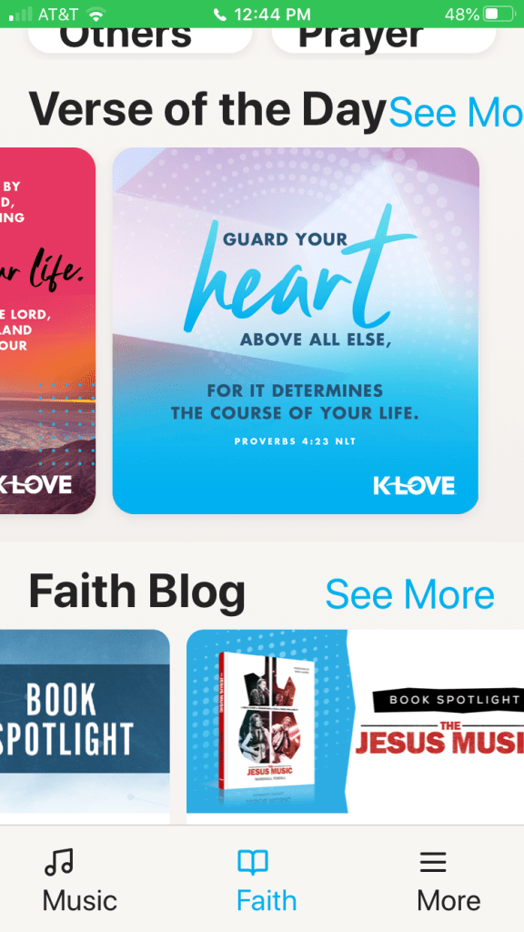 K-LOVE is a positive, Christian radio station and this is their app. You can listen to music through it. Looks good. https://apps.apple.com/us/app/k-love/id589478573