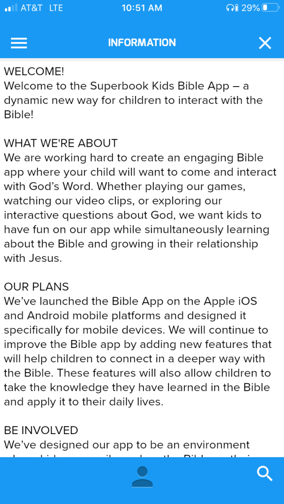 Superbook is a nice app from CBN based on the TV show. Lots of different options. It took a view minutes to download the updates . https://apps.apple.com/us/app/superbook-kids-bible/id606378030