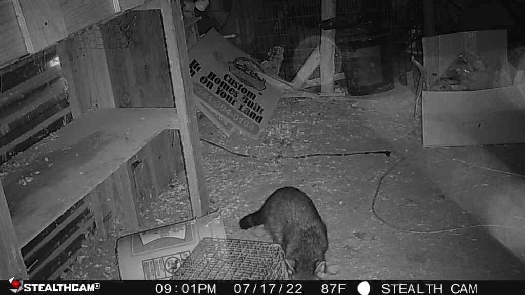Our little friend kept evading the trap. But eventually he got caught. Raccoons are extremely clever and good at getting into small spaces, opening containers, and killing chickens. A camera can help you know what is going on.