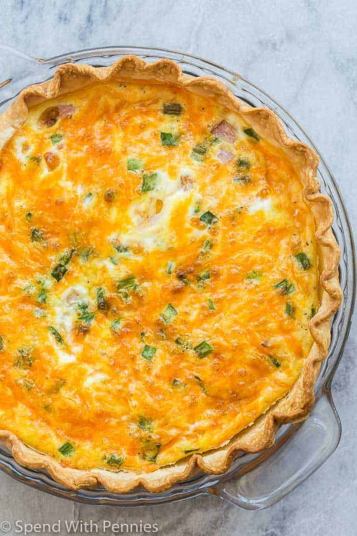 Quiche. A fancy looking scrambled egg pie that’s nice for lunch or brunch or anytime. Pour beaten eggs mixed with chopped veggies, cheese, and a little cream or milk into a pie crust. Bake in oven.