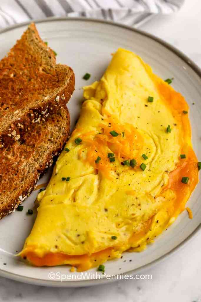 Omelets are a little more work than scrambled eggs, but not much. The ingredients are very similar, but you don’t stir the eggs while you cook the omelet. You can use an omelet pan or small non-stick skillet.