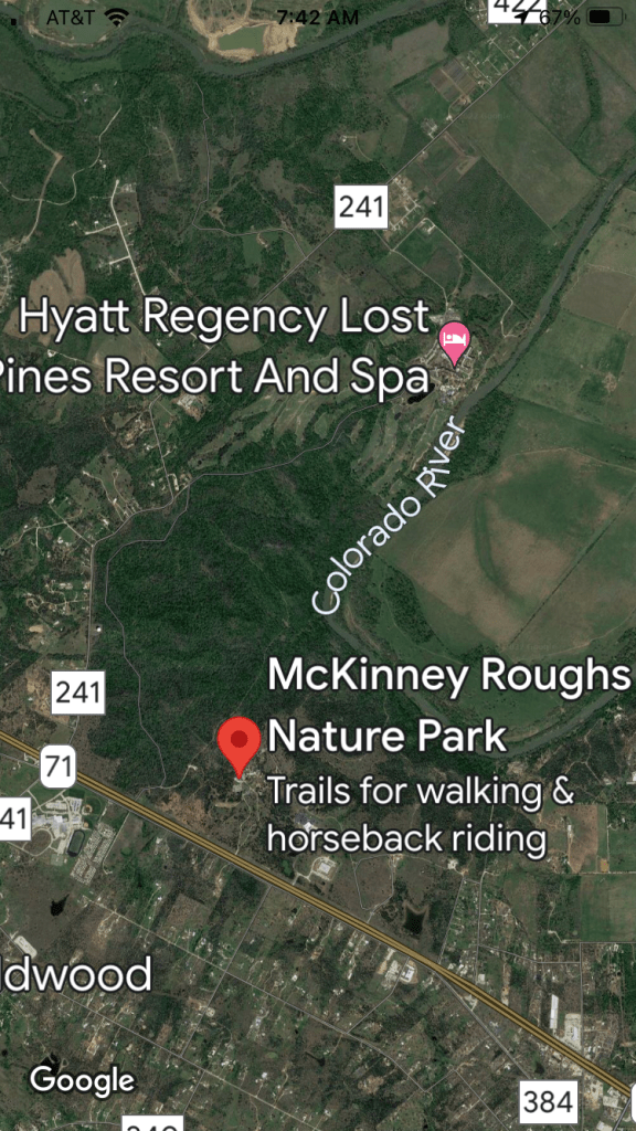 Mckinney Roughs is an LCRA park on Highway 71 between Austin and Bastrop. The actual location is Cedar Creek but not many people have heard of that, or they confuse it with Cedar Park which is northwest of Austin. The park hugs a bend of the Colorado river and shares a boundary with the Hyatt resort.