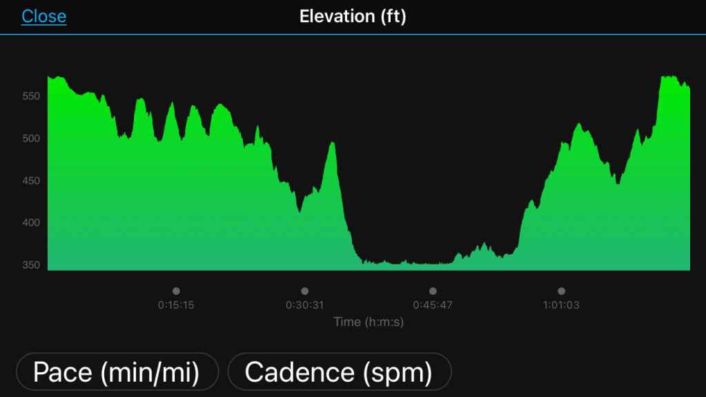 Overcast skies made it a bit humid, but the 65 degree temperature was nice. I wore shorts and a short sleeve tech shirt, my Altra Timps, and injinji socks. My Nathan vest held all my gear, water, phone, glasses, some peanut M&Ms, a dog bone, and my car keys.