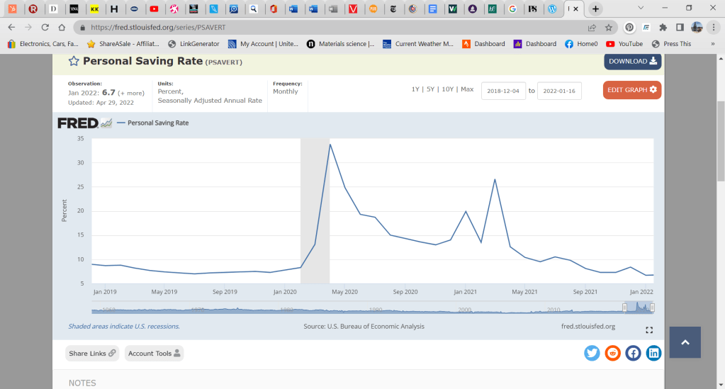 Does Biden know that personal saving is back to pre-Covid levels? I am not sure where all the supposed excess spending is coming from. According to Politico, the problem is spending too much on consumer goods and not enough on services. Hmm, seems like the lockdowns triggered some online buying habits that are hard to break. That must mean that people are using credit cards or switching their spending from one category to another.