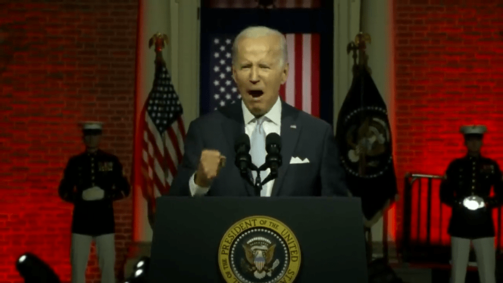 He made dubious claims that America’s democracy is under threat by certain people who want to use violence and insurrection because they didn’t win. Then he claimed that these people want to keep other people from voting. Personally I don’t know anyone like this. I think that’s probably Russian misinformation.