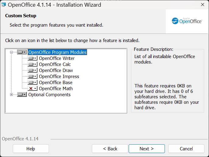 - On the Setup Screen, choose Writer and any other modules you want to install.