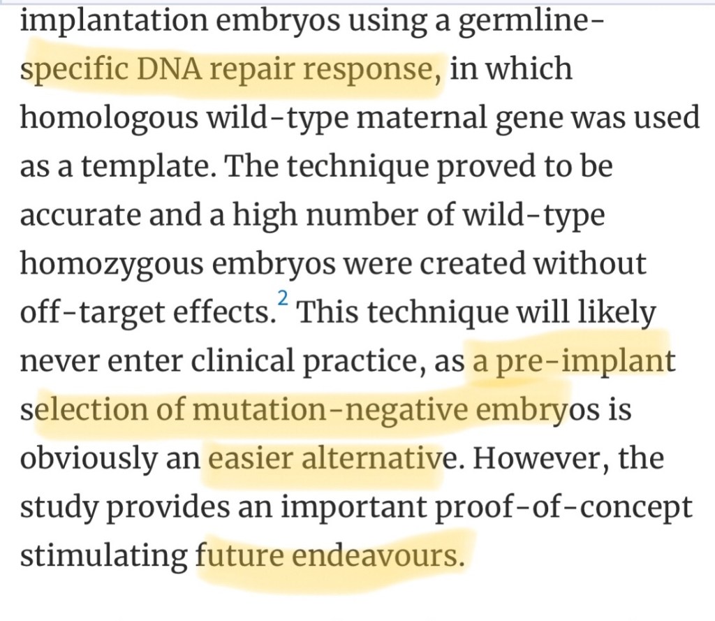 Just thought I would share how gene editing is being used in lab settings to alter DNA of test tube babies . Iām sure that will never be used for evil purposes . š Note the comment that it will be easier to simply select embryos without the unwanted mutations. Chilling.