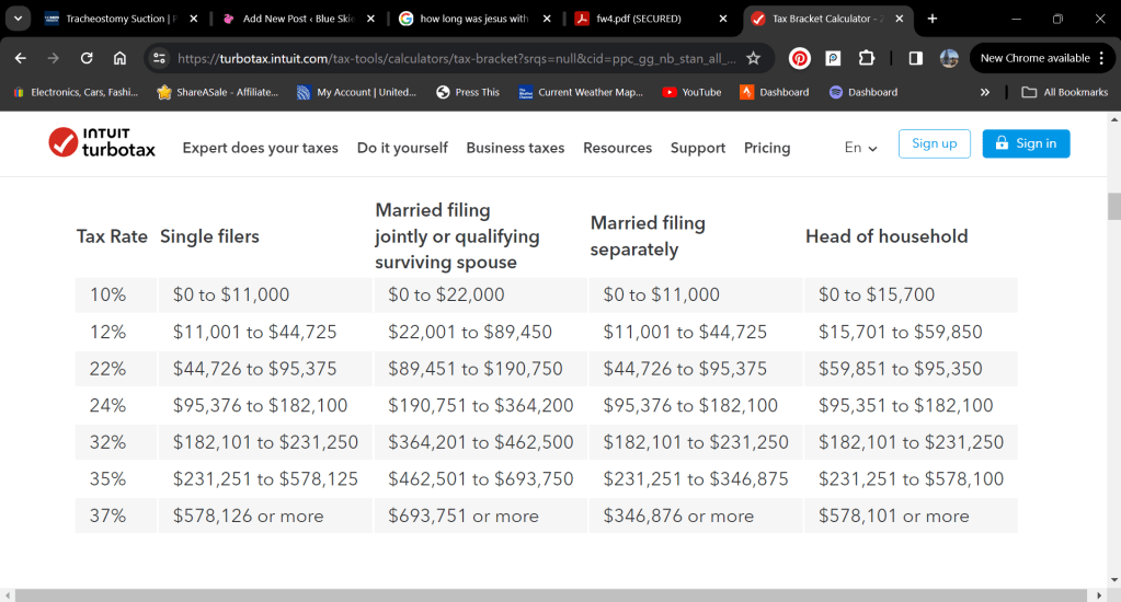 For example, based on the tax bracket chart below, the amount of Income over $44,726 is in the 22% bracket. But that is after deductions, so if you earn $45,000 on your Year To Date on your paycheck, you should have about $3,533 taken out to avoid owing money and get no refund. This would mean that the first $11,000 of your income is taxed at 10% and the next $33,726 at 12% and the rest at 22%. However, if no one claims you as a dependent, you will reduce your taxable income off the top with the Standard Deduction of $13,850 for Single filers, meaning that only $20,000 of your income is taxes at 12% and $150 at 22%. The Standard deduction doubles for Married Filing Jointly filers. But, to be safe, in case you get a raise or have untaxed overtime, if you are close to the 12% bracket, you might want to go with that. Unless you are contributing to a Retirement plan which can also reduce your taxable income and even give you Saver’s Credit if your income is not too high. But if your income is as above, and if you have 10% taken out, you would get a small refund.