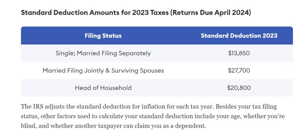 If someone is claiming you as a dependent, your deduction is figured differently. Per the IRS, f you can be claimed as a dependent by another taxpayer, your standard deduction for 2023 is limited to the greater of: (1) $1,250, or (2) your earned income plus $400 (but the total can’t be more than the basic standard deduction for your filing status). Example: You earned $6000. You can deduct all of that from your taxable income, plus $400 and get a refund if you had any federal withholding. But if you earned $20,000, you can only deduct $13,850 from your taxable income.