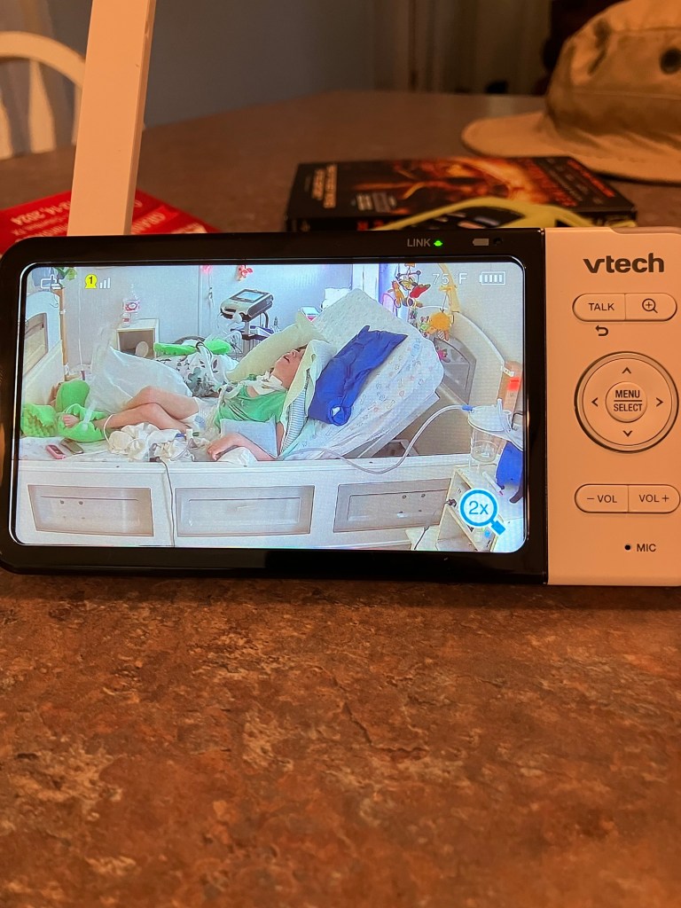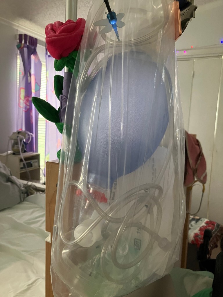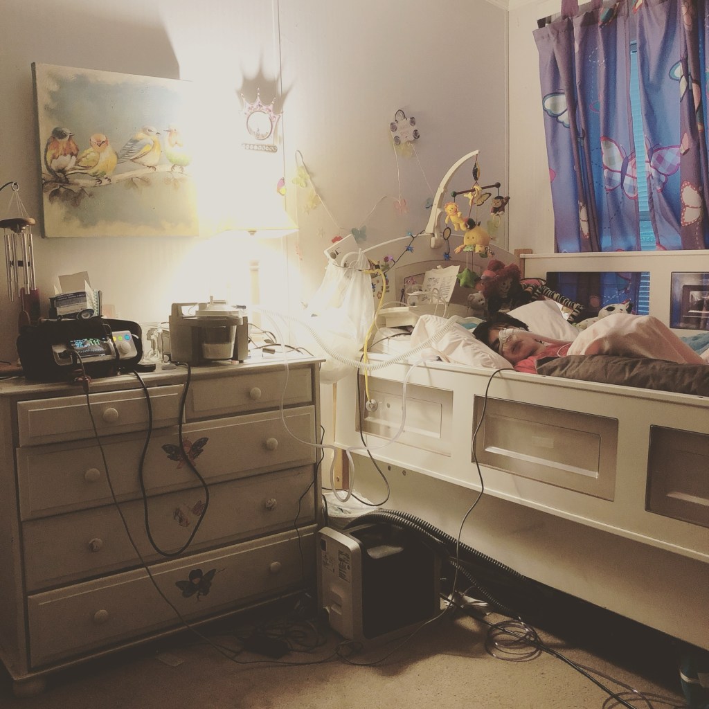 Nights can be tough. At night she often sets off the ventilator alarm because her sleep schedule is off so me and John are up and down a lot and we are sleep deprived like when we had new babies in the house.