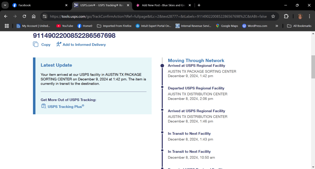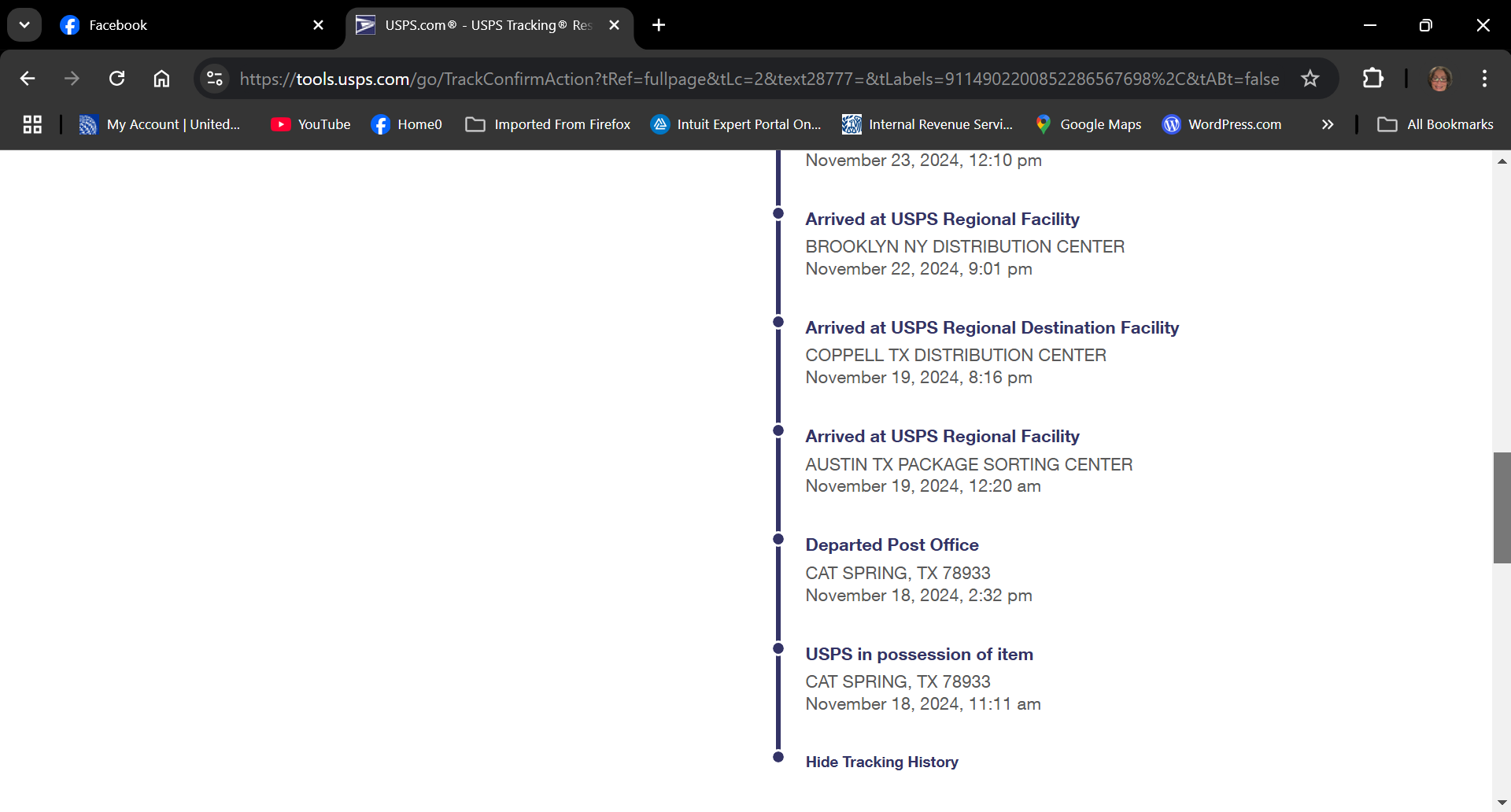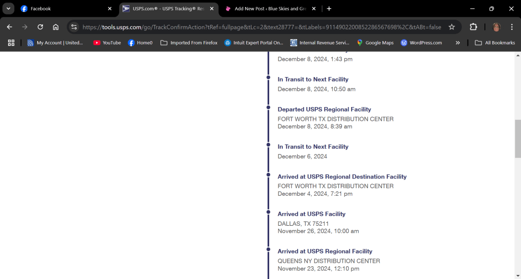 The following is the journey that my package has taken. It was mailed on November 18 and has been touring the country. It left Texas, then instead of being sent to the address which was about 2.5 hours away, was sent to New York for some reason. Then it came back to Texas and was very close to it’s destination and then got sent to Austin AGAIN for more fun times.