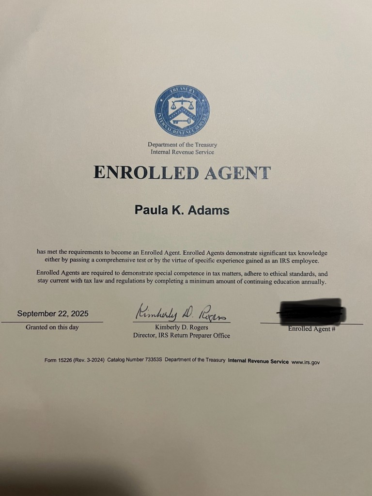 I don’t think I have updated on this blog yet that I’m OFFICIALLY an Enrolled Agent now! After many hours of studying and three difficult tests, and even with the IRS being partially shut down, I have received both my Enrolled Agent credential and my E-File number permitting me to legally file taxes for people for pay and represent taxpayers before the IRS.